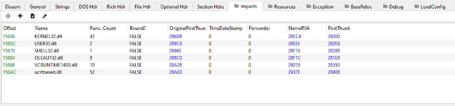 In the revised PE file, the import directory table no longer contains the malicious library and function.