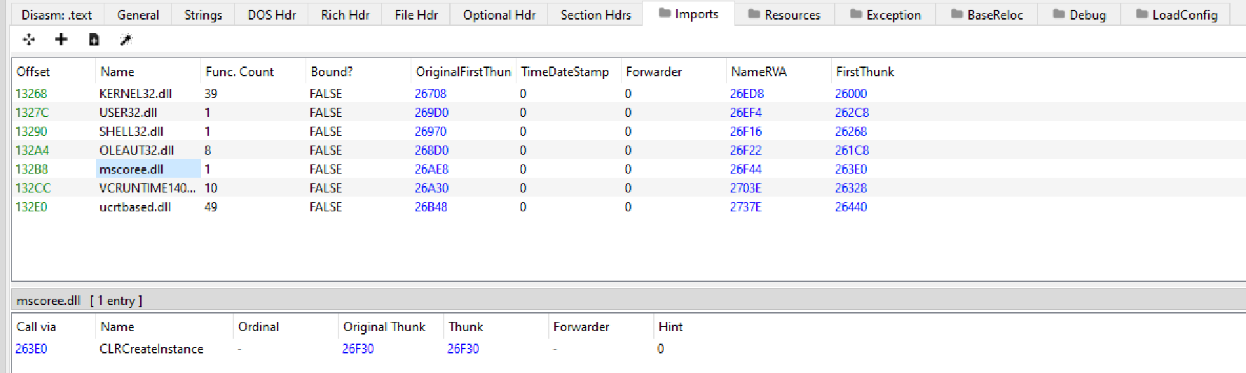 When the header and the library are included in the loader, the import directory table of its Portable Executable (PE) file would include the mscoree.dll DLL and the entry of CLRCreateInstance. EDR could treat this as malicious file by static analysis of the PE file and its import directory table.